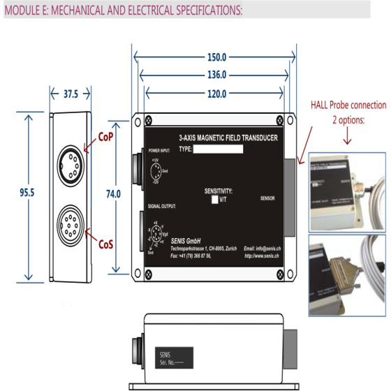 The F3A denotes a range of SENIS Magnetic Field-toVoltage Transducers with fully integrated 3-axis Hall Probe. The Hall Probe contains a CMOS integrated circuit, which incorporates three groups of mutually orthogonal Hall elements, biasing circuits, amplifiers, and a temperature sensor.