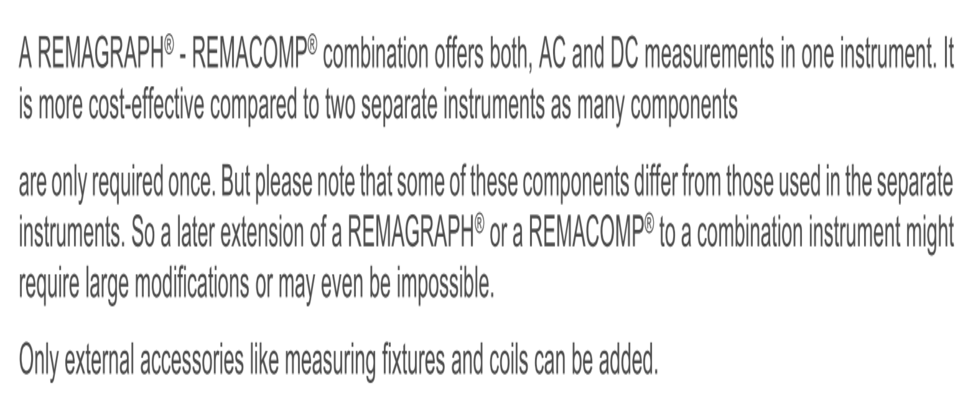 The combinations of PERMAGRAPH®–REMAGRAPH® or REMAGRAPH®-REMACOMP® combine the measuring possibilities in one instrument. Since some components are only needed once for magnetic hysteresis, the combination is an inexpensive alternative to separate devices and at the same time offers many application possibilities.