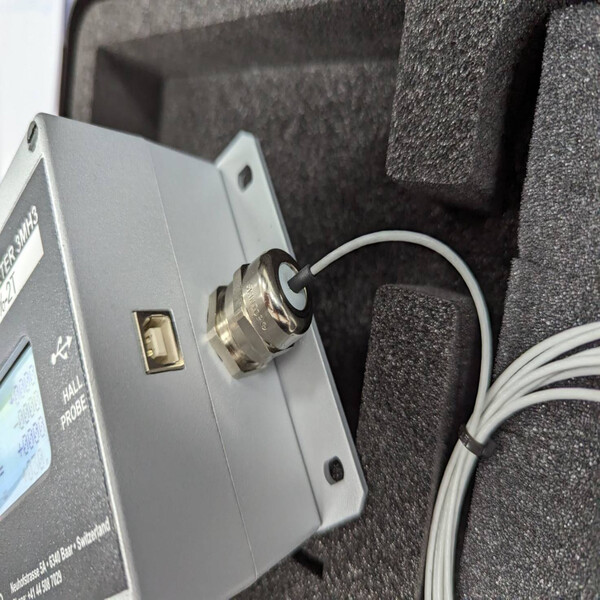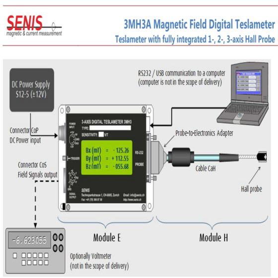 Teslameter with fully integrated 1-, 2-, 3-axis Hall Probe incorporates a high accuracy magnetic flux density-to-analog-voltage transducer with a highlevel, temperature compensated output signal for each of the three components of the measured magnetic field (Bx, By and Bz). A digital module is additionally applied to the analog transducer to form the digital Teslameter.