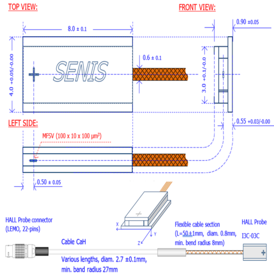 Low Noise Teslameter with integrated Hall Probe incorporates a high accuracy magnetic field-toanalog-voltage transducer with a high-level, temperature compensated output signal for each of the three components of the measured magnetic flux density, Bx, By and Bz. A digital module is additionally applied to the analog transducer to form the digital Teslameter. Digital Teslameter provides the possibility of automatic data acquisition via a USB serial interface by a host computer.